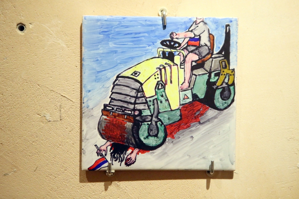 На одній зі своїх робіт Олександр зобразив путіна за гратами, поставивши на лобі знак зеленкою – щоби його знайти та знищити. Ще одна його картина називається «Непроханий гість»: величезний шершень у кольорах «аквафреш» прапора росії прилетів на землю жовто-блакитних мурах, які згуртувалися і змогли дати відсіч. Третя робота, розміром десь 3х2 метри, — «ОРКупація» окупантів, художник зобразив у вигляді мавп з автоматами.