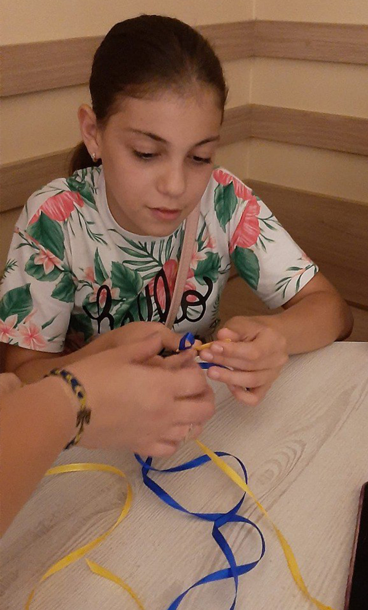 Як зазначають у дописі, під час плетіння браслетів діти використовували жовті та блакитні стрічки, що символізують кольори українського прапора. Свої вироби учасники майстер-класу планують дарувати рідним та військовим.