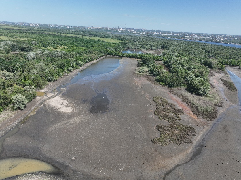 Оголене дно Каховського водосховища на території заповідника «Хортиця» в червні 2023 р.
