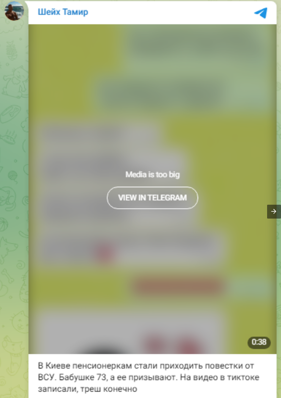 Перша спроба вкиду про бабусю, яку мобілізують, була зроблена пропагандистом “Шейхом Таміром” ще 1 листопада. Це була аудіоверсія з повідомленнями від бабусі і фотографією якоїсь повістки. Тоді вкид не зайшов, тому тепер зробили просунуту відео версію.
