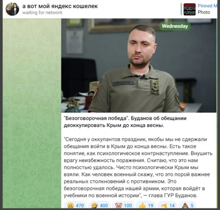 - Російський пародійно-пропагандистський канал, надихаючись заявами Євгенія Пригожина про різні види «взяття» Бахмута, приписав голові ГУР Кирилу Буданову фейкову цитату про «психологічне взяття Криму».