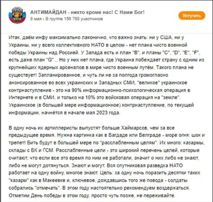 А звідки взагалі взялася ідея «психологічного взяття» чого завгодно? Ще на початку травня у російських мережах активно поширювали текст про те, що Україна за підтримки США вже почала такий собі «психологічний контрнаступ», аби підірвати Росію зсередини і змусити російську армію бігти (http://surl.li/homkv)