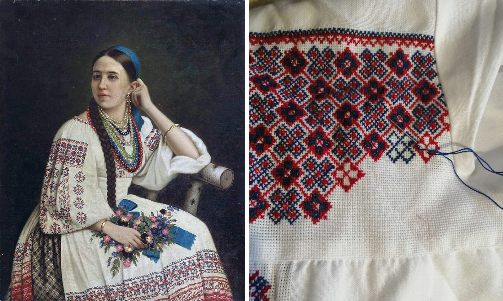 Викрадена окупантами картина Михайла Брянського «Портрет дівчини у вишиваній сукні» з колекції Херсонського художнього музею та Вишиванка Перемоги Інни Микуцької у процесі роботи