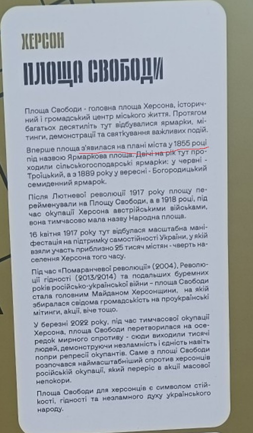 У Херсоні почали встановлювати меморіальні знаки біля важливих історичних місць, де відбувалися події, значущі для міста. На новому меморіальному знаку біля площі Свободи виявили неточність у даті її заснування.