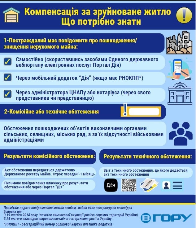 Люди, які постраждали від російської агресії та втратили житло, зможуть отримати компенсацію. Які перші кроки до отримання компенсації необхідно зробити, — дивіться в інфографіці.