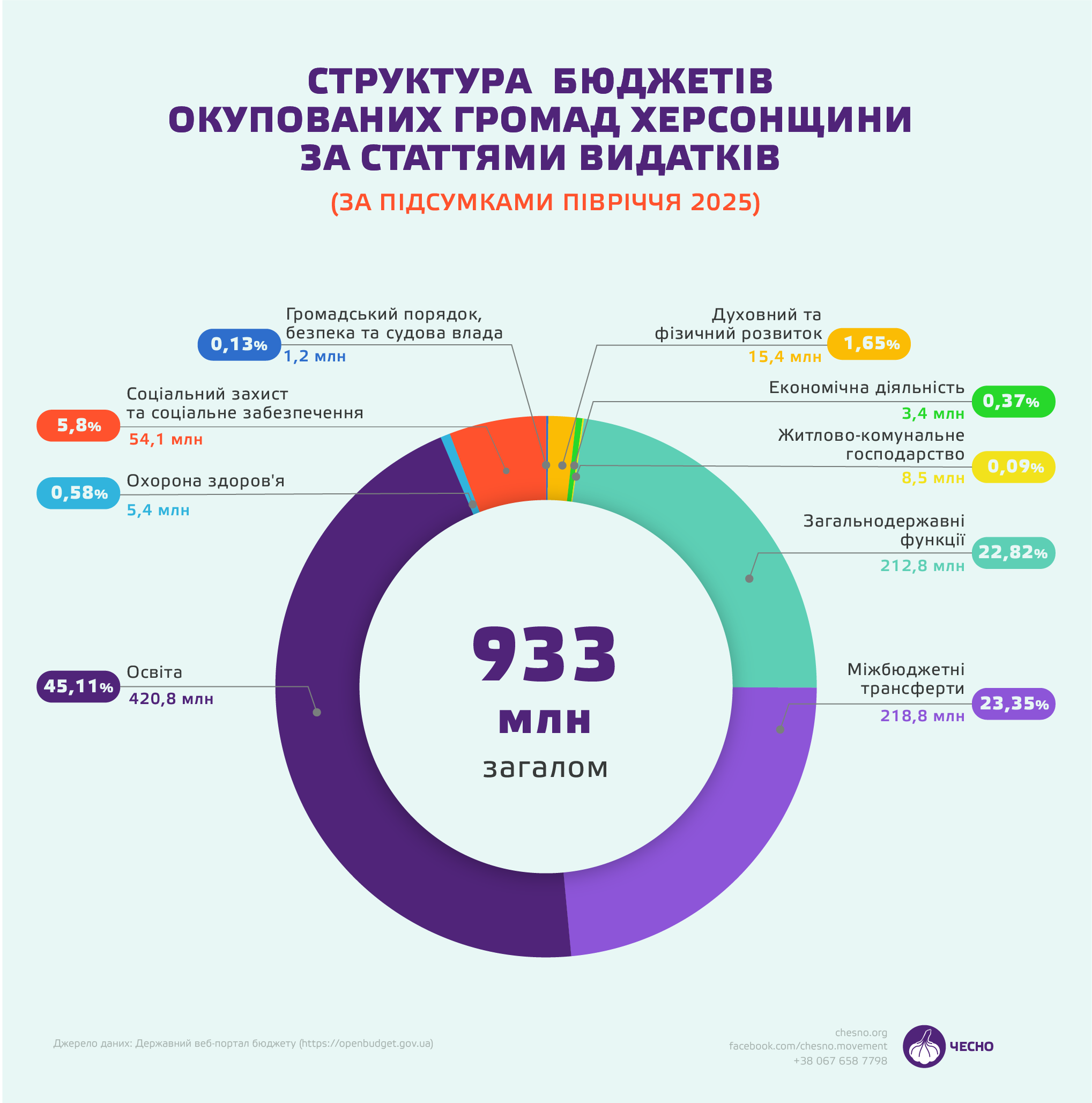 Найбільше коштів у першому півріччі 2025 року витрачено на освіту — понад 45% або 421 млн грн. Наприклад, в Олешківській міській громаді освіта займає 69% бюджету. Це зарплати та доплати педагогам, витрати на обладнання, інвентар і відрядження.