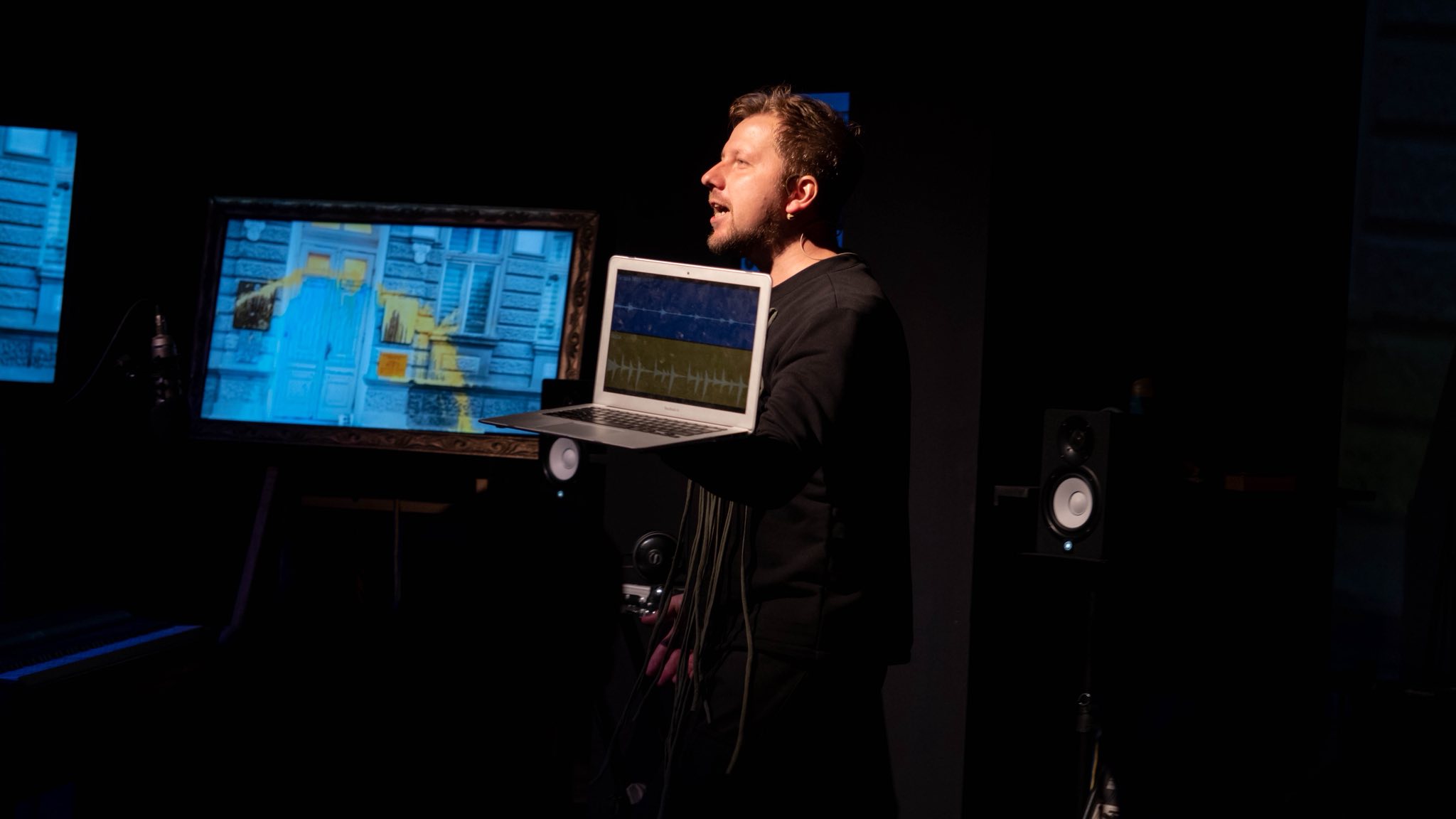 Все, що відбувається (під час вистави – ред.), всі новини, історії, це не фейк, всі картини, це справжні картини, крім однієї, де був підірваний міст, – каже Олексій.