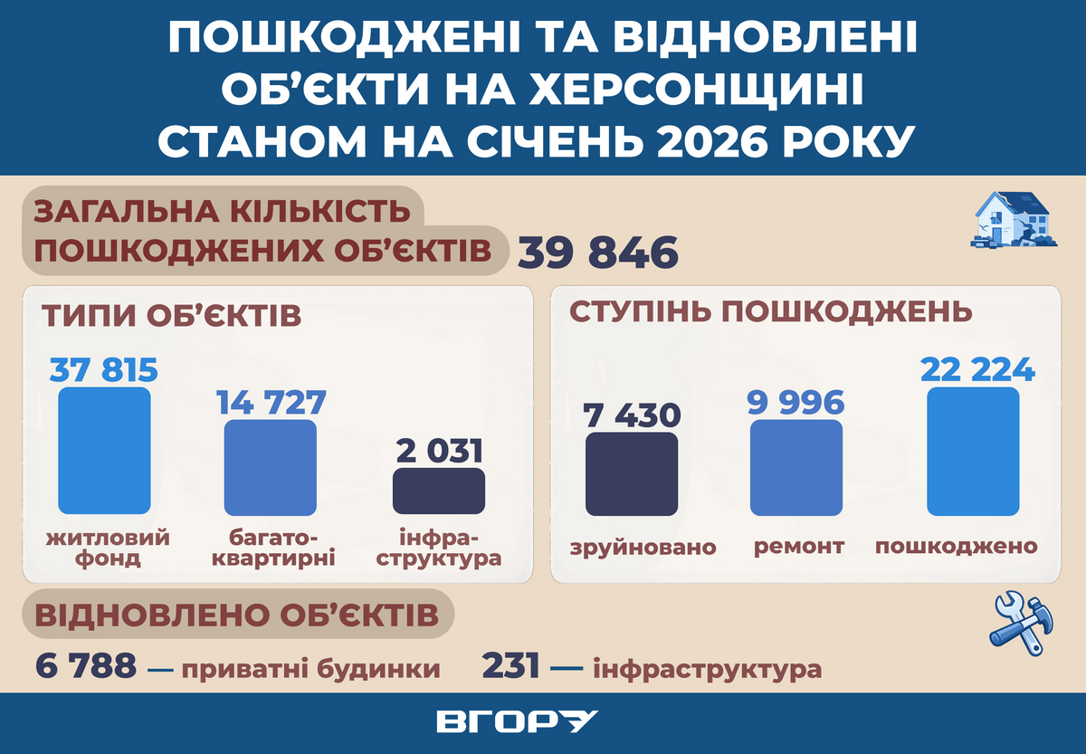 На деокупованій території Херсонської області на 16 січня 2026 року зафіксували 39 846 пошкоджених і зруйнованих об’єктів.