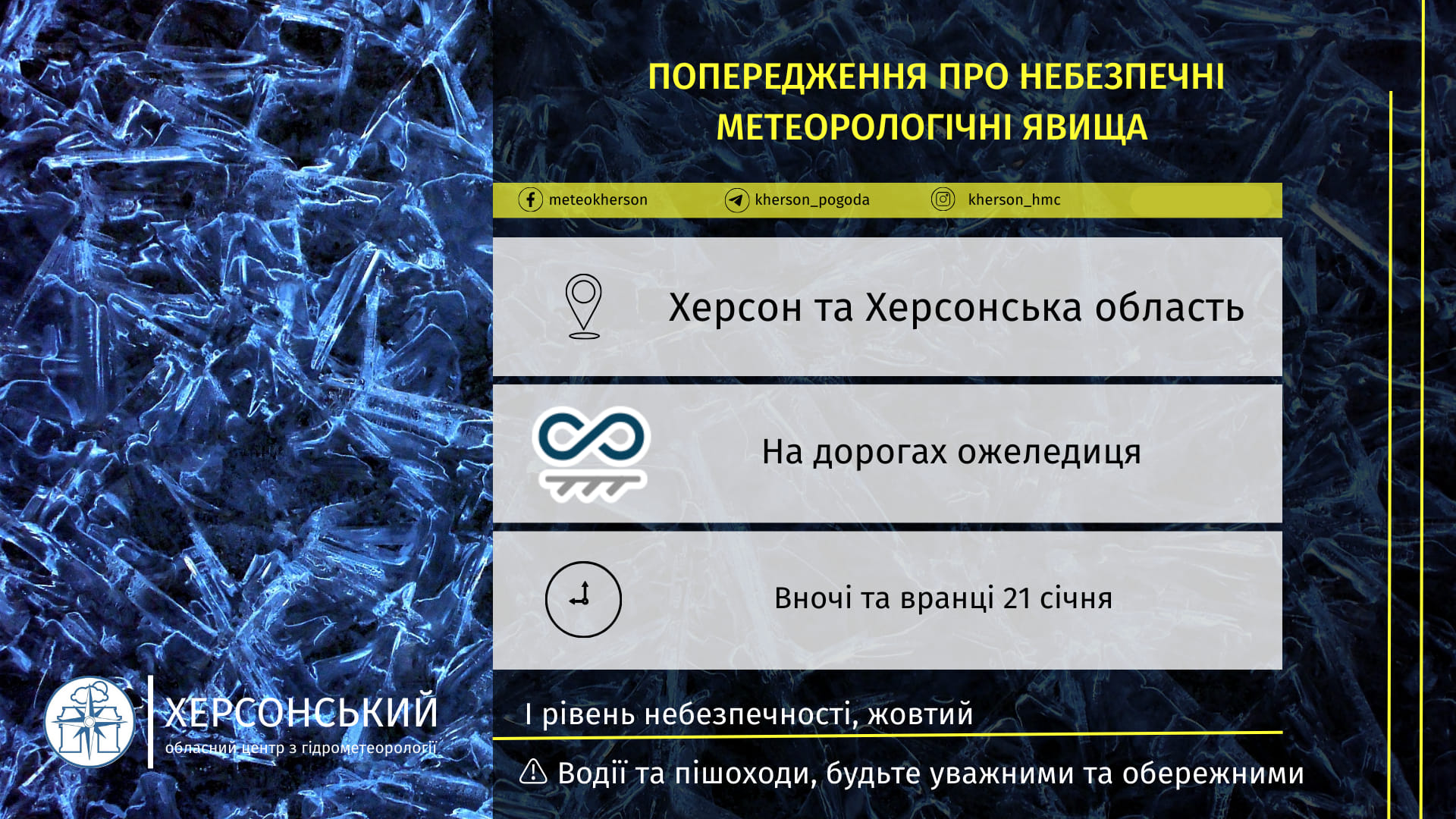Синоптики прогнозують 21 січня в Херсонській області на дорогах ожеледицю. Рівень небезпеки – жовтий (перший).