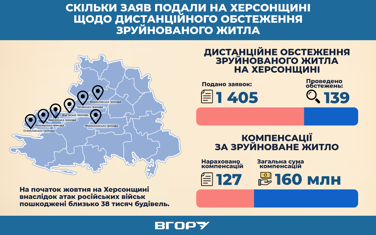 Дистанційне обстеження зруйнованого житла проводили у Білозерський, Дар’ївській, Станіславській, Бериславській, Тягинській, Херсонській та Новокаховській громадах Херсонської області.