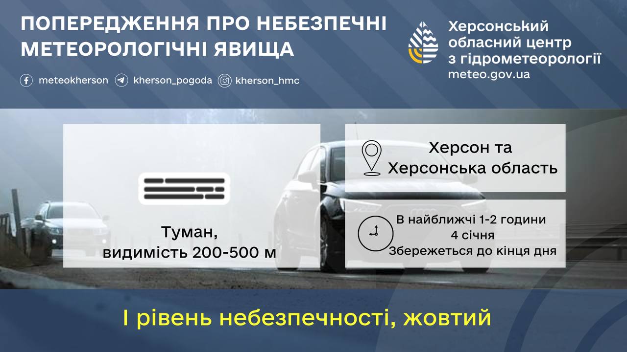 У Херсонській області упродовж наступних 1-2 годин збережеться туман з видимістю 200-500 м. Рівень небезпечності — І, жовтий.