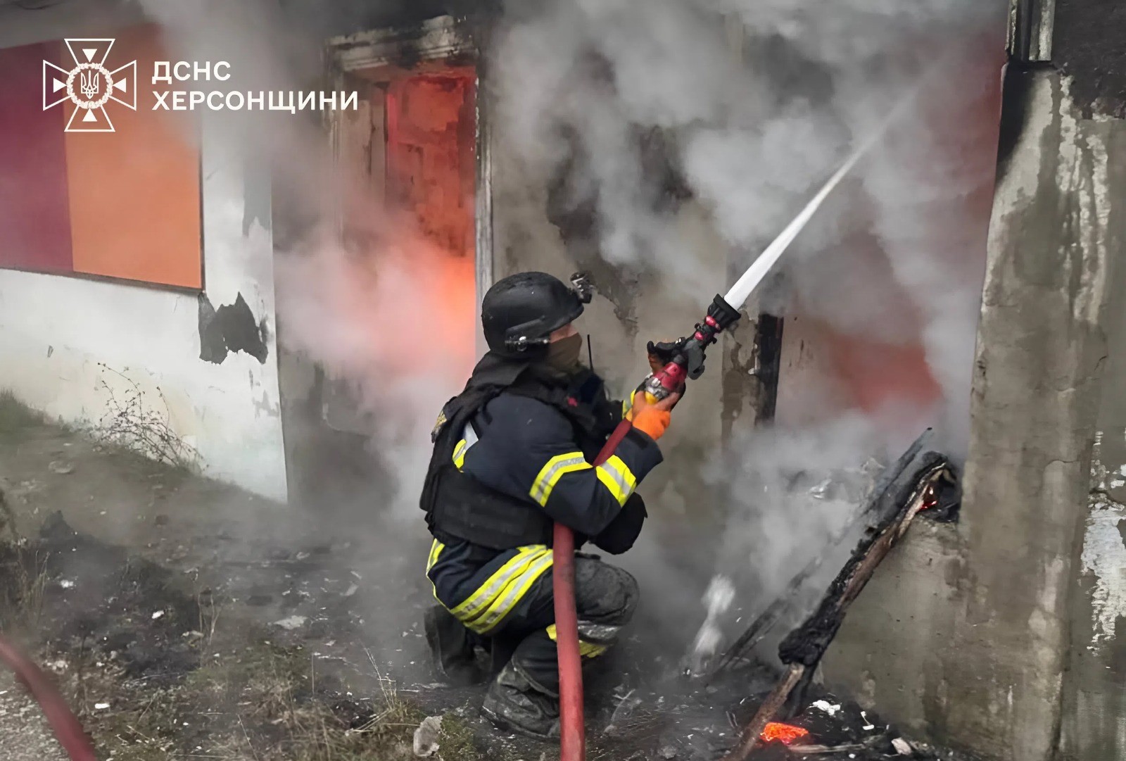Рятувальник ліквідує пожежу. Фото: сторінка ГУ ДСНС у Херсонській області
