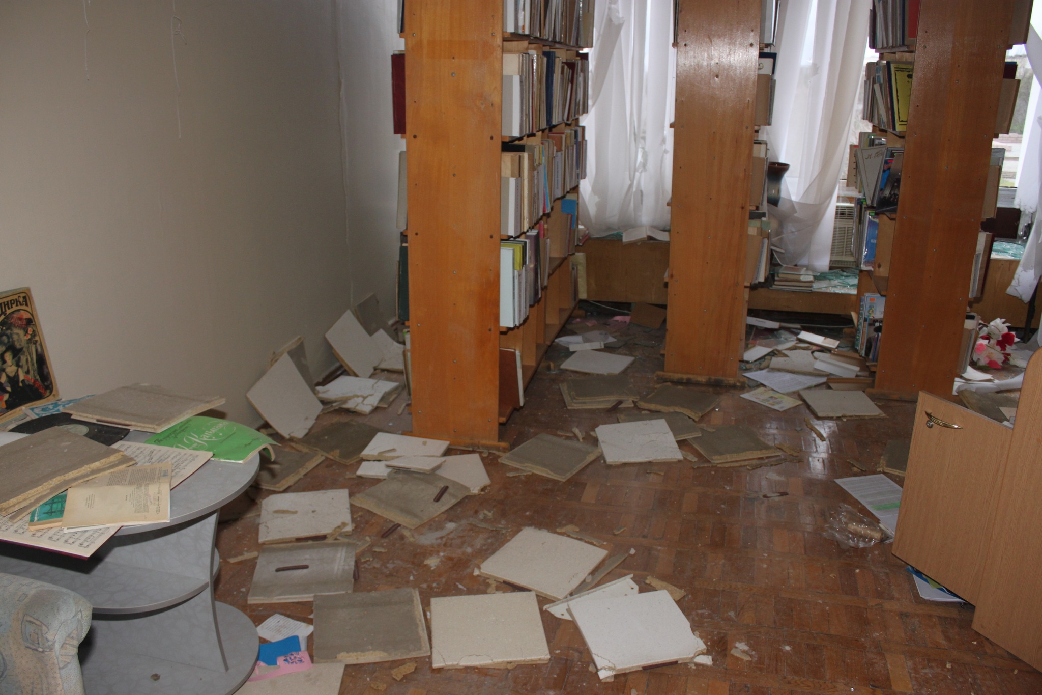 Вікна забиті, всередині приміщення ще холодно і волого, стеля падає, книжкові, полиці спустошені, виставкові стенди книгосховища, на яких колись красувалися цінні видання, порожні…