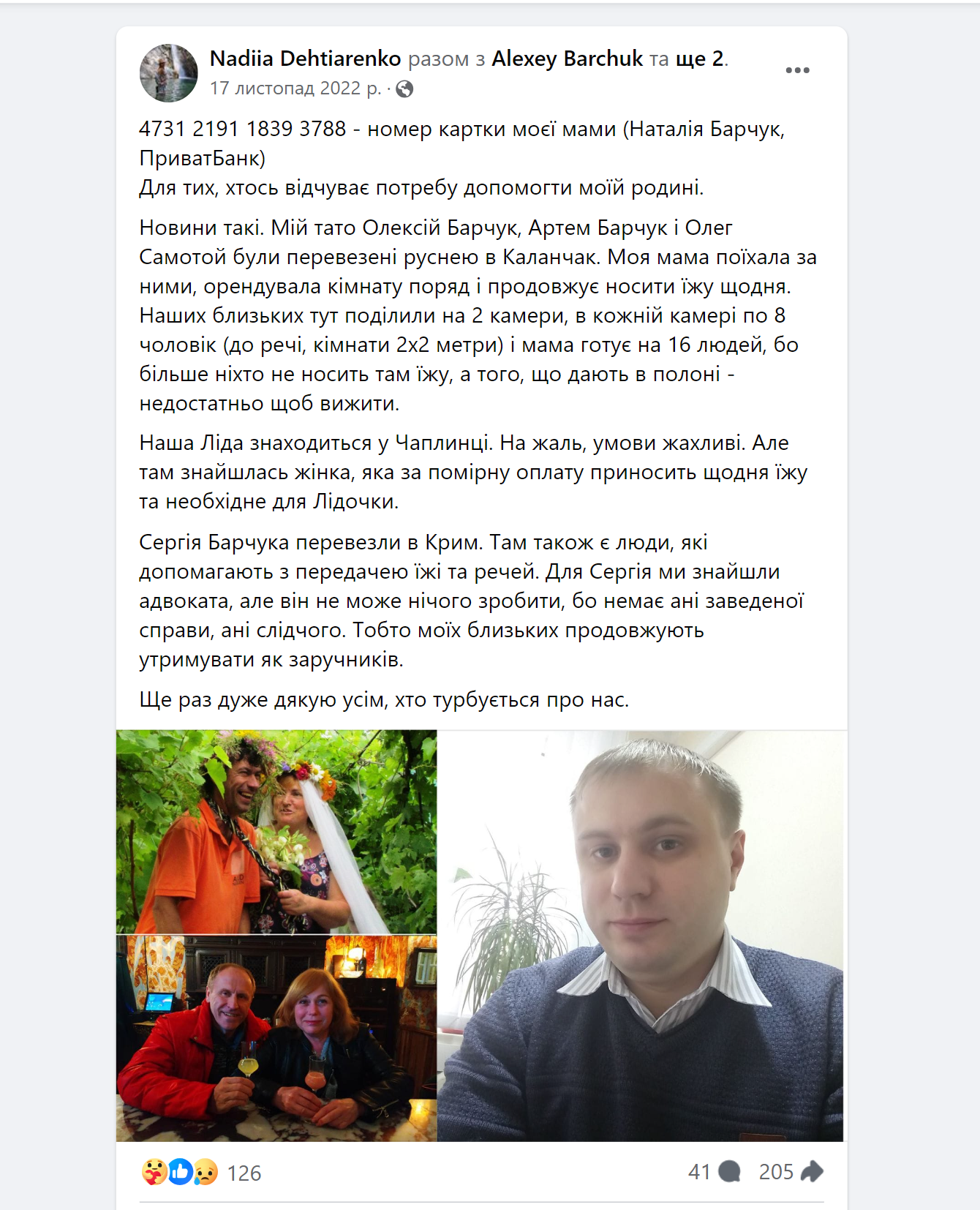 «Було дуже тяжко, бо всі гроші росіяни забрали, але багато друзів, родичів і просто сторонніх людей, нам допомагали, – ділиться Олексій Барчук. – Моя донька описала ситуацію у Фейсбуці, попросила допомогти й дала Наталчину картку. На неї дуже багато херсонців, зовсім незнайомих людей, переказували гроші. Тож Наталка могла приносити передачі».