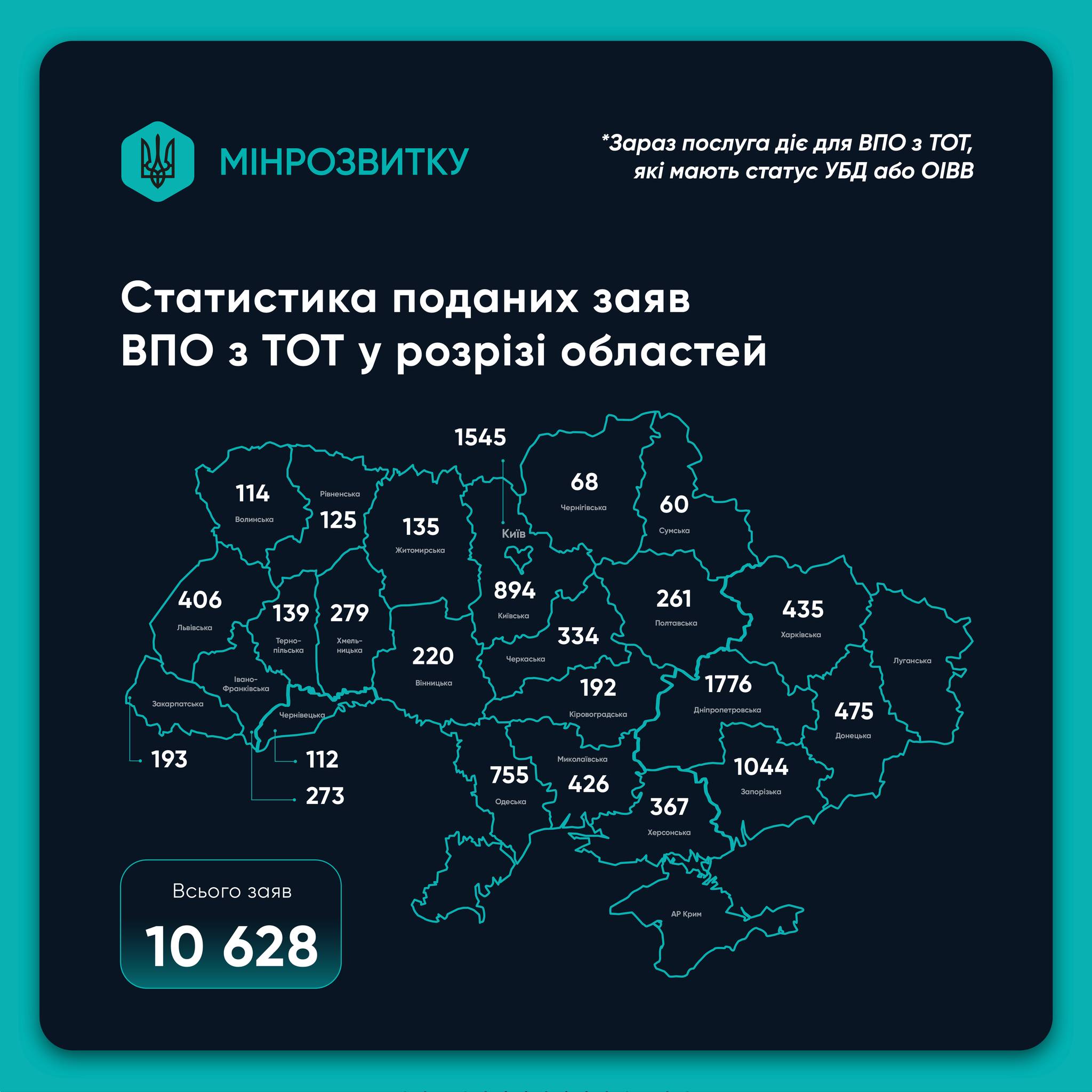 Станом на 2 грудня ВПО подали 10 тисяч 628 заяв: з Донецької області – 3 566 заяв, Луганської – 3 127, Запорізькій – 2 067.