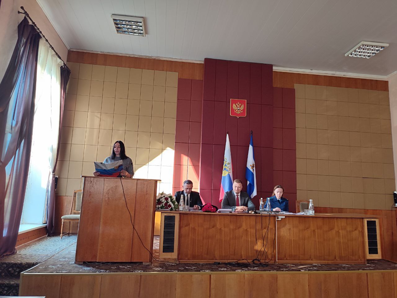 Євгенія Кузьменко на засіданні незаконної ради депутатів, де її призначили незаконною очільницею Новотроїцького муніципального округу. Фото: окупаційні ЗМІ