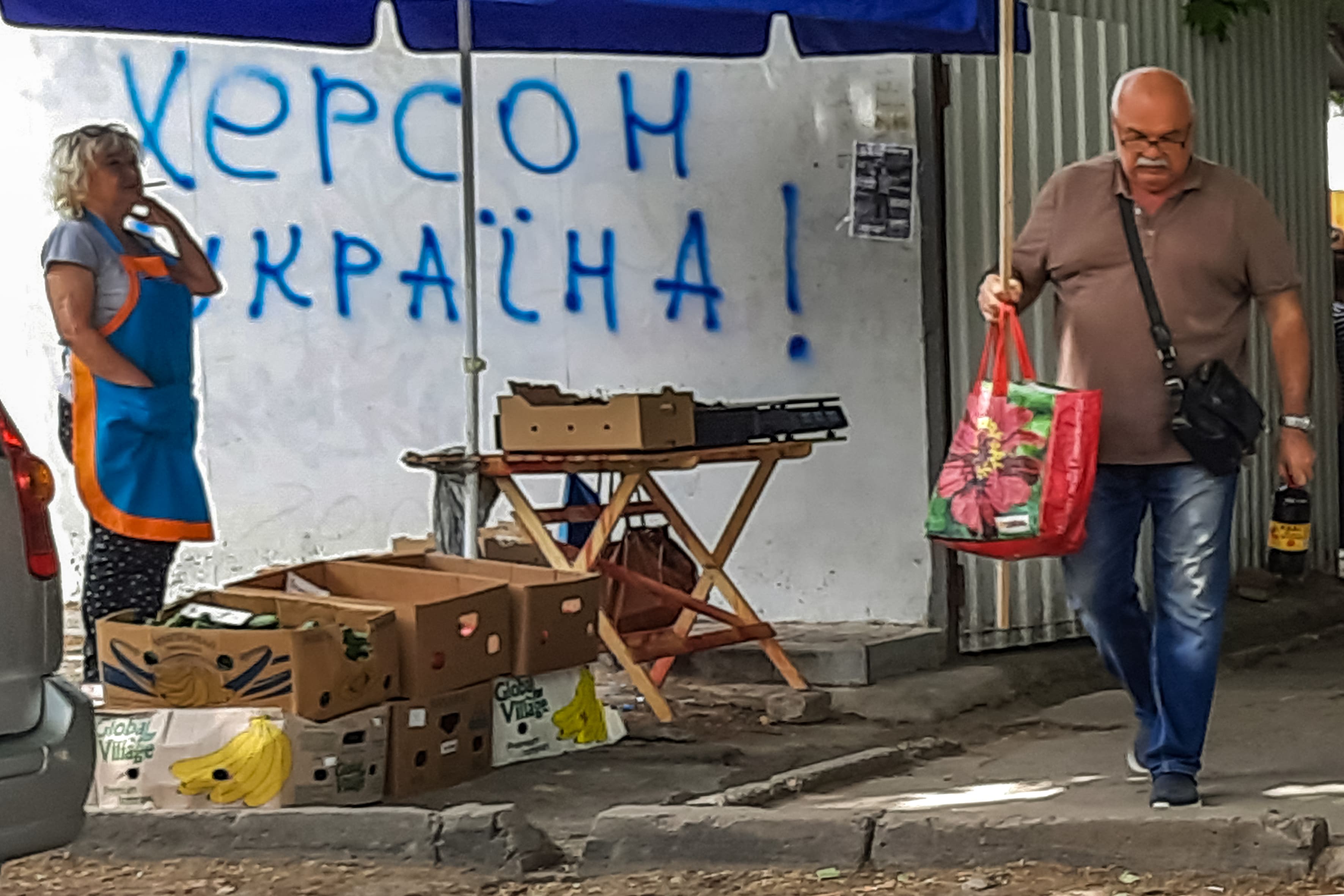 Розповідав про окупований Херсон і Олександр Корняков, одна з його світлин закарбувала й мовчазний протест проти окупації. Патріотичні графіті — це один із видів спротиву. Херсонці малюють картинки, пишуть гасла всюди, росіяни намагаються їх замальовувати своєю символікою, для цього завозять людей із Криму, Краснодара. Але попри намагання окупантів насадити свою ілюзорну реальність, українці малюють своє і не мають сумнівів, що Херсон — це Україна. «Щодня можна побачити листівки, графіті, їх замальовують, вони з'являються знову, — розповідає фотограф. — Як би окупанти не старалися, не замальовували написи, вони проявляються навіть через фарбу. Протест триває».