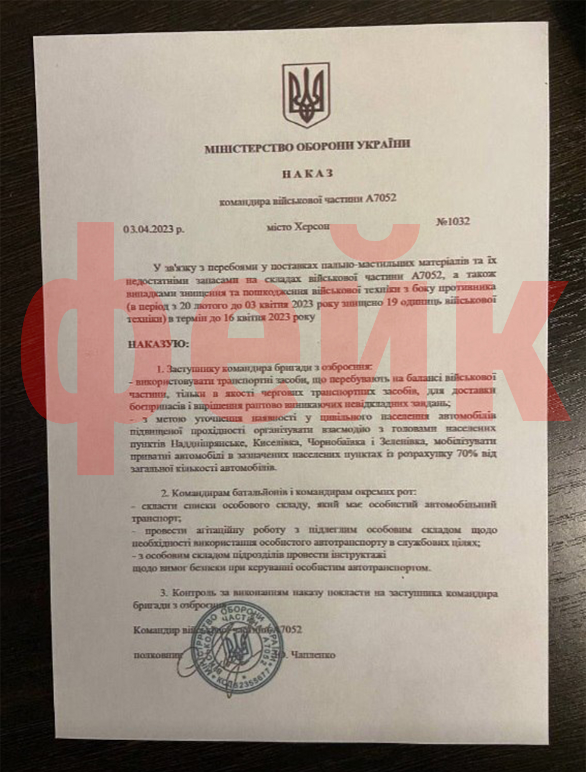 Російські телеграм-канали розповсюджують фото наказу, у якому нібито командир військової частини А7052 просить мобілізувати приватні автомобілі в населення Наддніпрянського, Киселівки, Чорнобаївки та Зеленівки. Текст допису стверджує, що нібито йдеться про наказ командира 123 територіальної бригади ЗСУ.