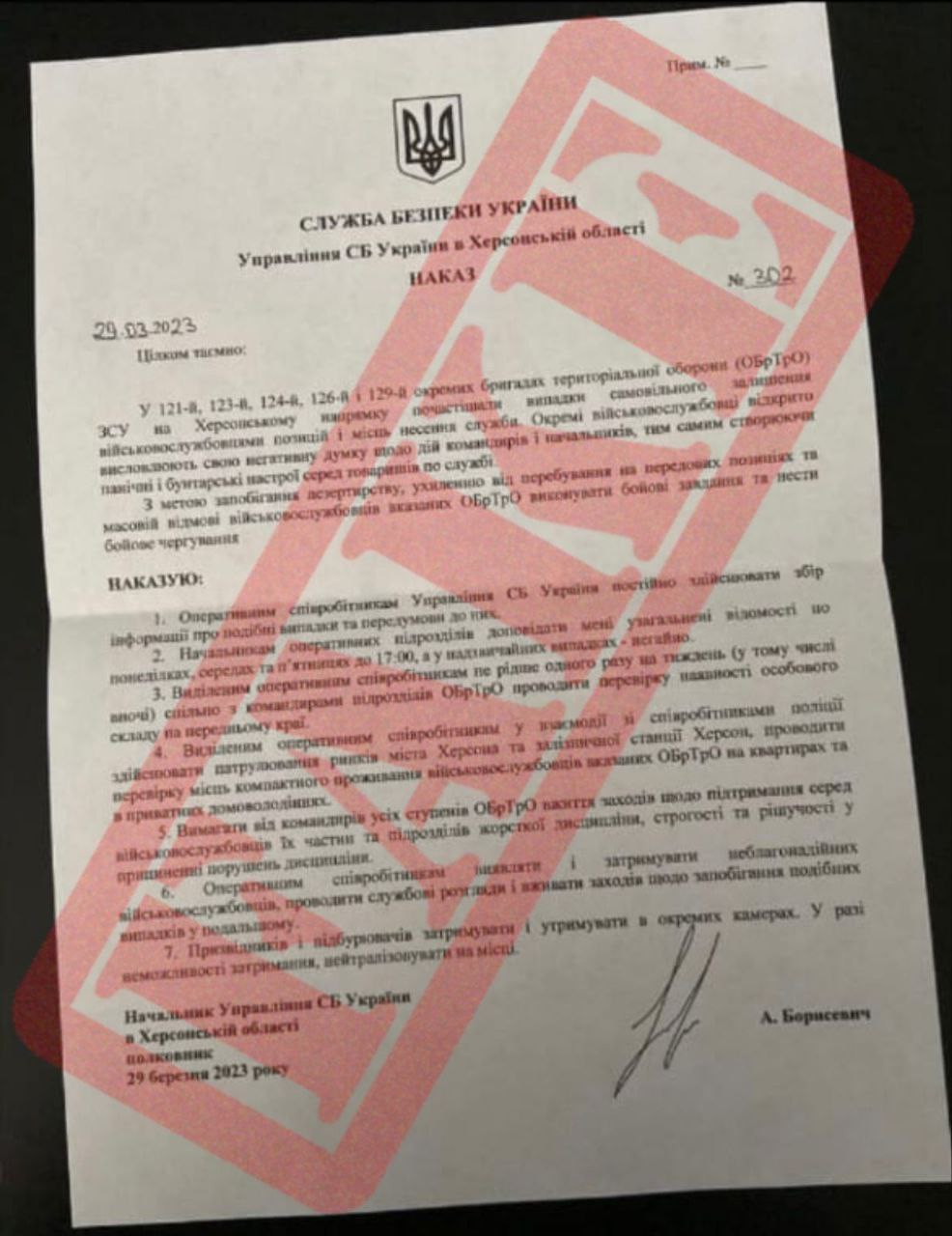 Російські окупаційні Телеграм-канали розповсюдили фейковий документ. Він стверджує, що нібито військовослужбовці бригад ТРО на Херсонському напрямку залишають місця проходження служби та висловлюють “негативні думки” щодо дій командирів. Тож, нібито для того, аби цьому запобігти, Херсонське управління СБУ наказує переслідувати військовослужбовців та нейтралізовувати їх.