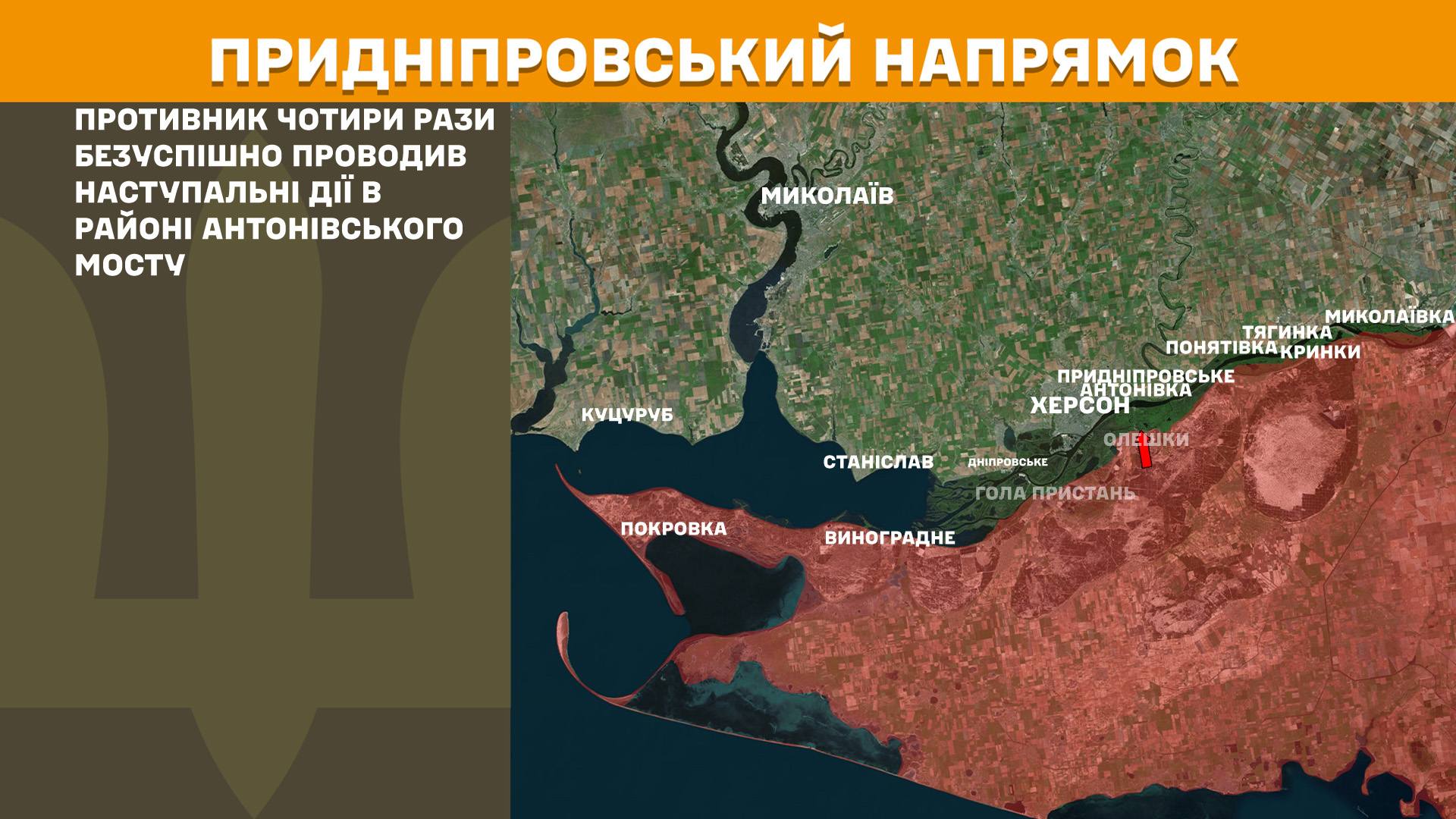 На Придніпровському напрямку 12 грудня російські військові чотири рази наступали в районі Антонівського мосту, що у передмісті Херсона. А також закріпитись на островах. Через що армія РФ зазнає втрат.