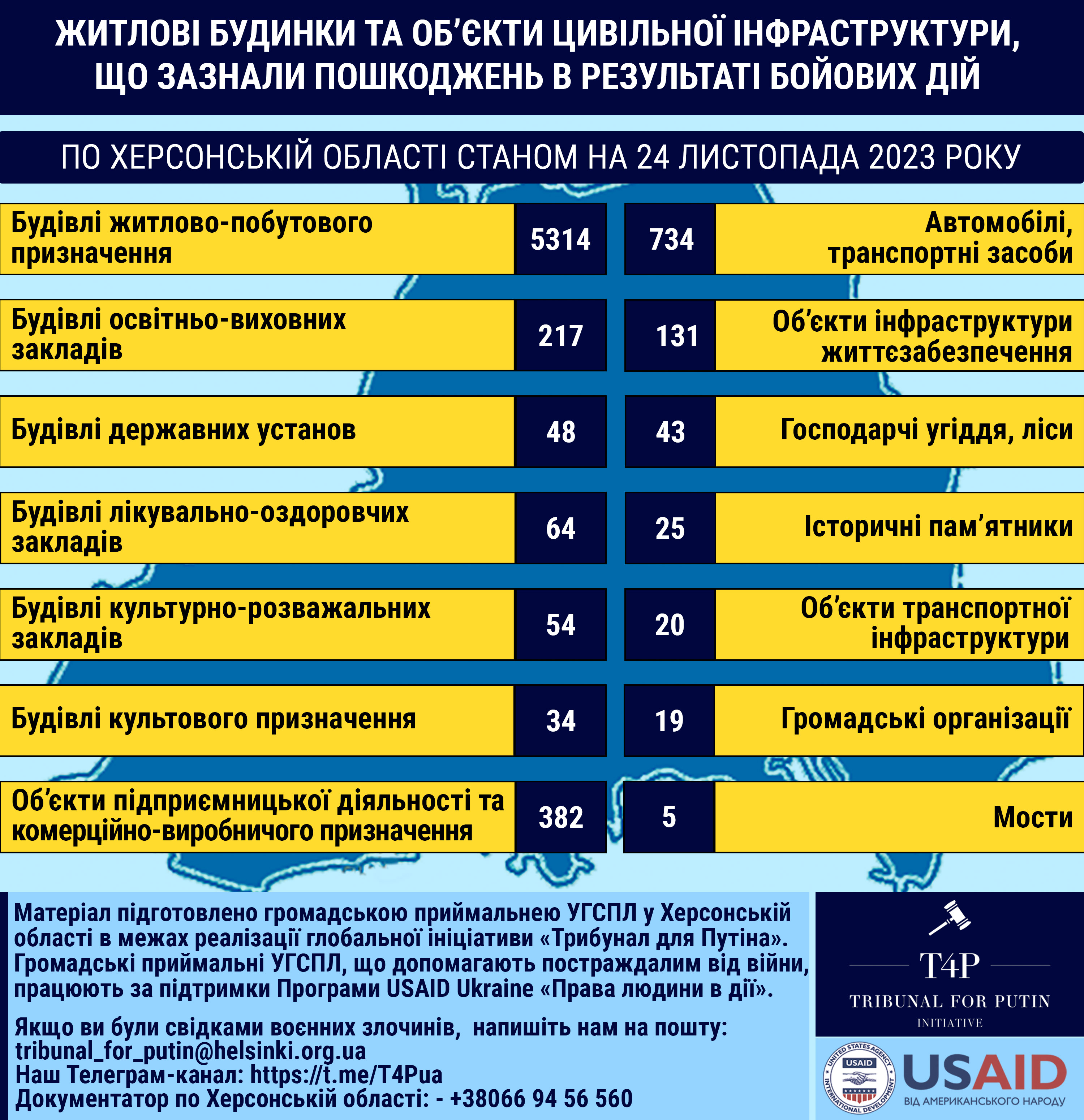 Станом на 24 листопада на Херсонщині пошкоджені 5 тисяч 314 житлових будинків, 217 освітніх закладів, 48 державних установ та 64 лікарні через російську агресію.