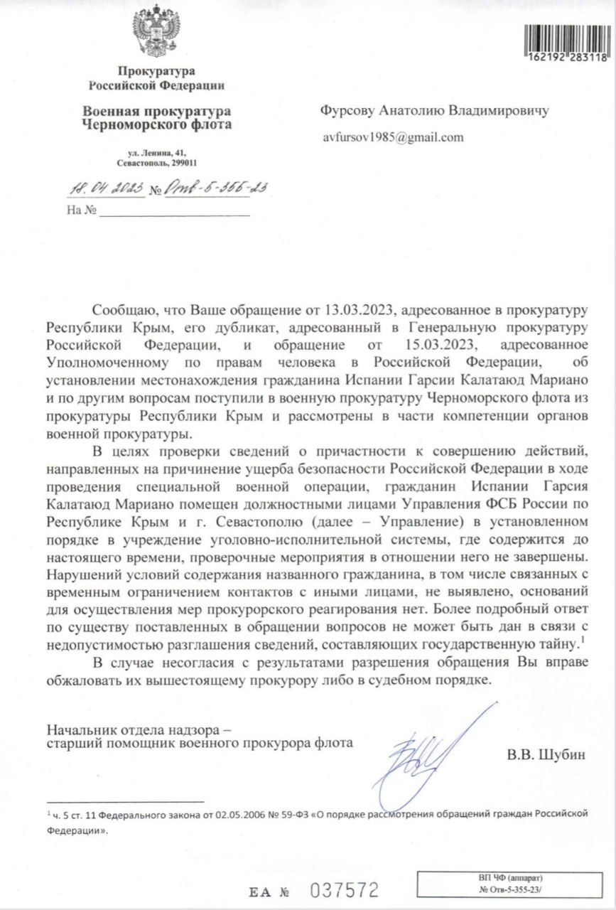 Лише наприкінці квітня цього року надійшов лист, у якому РФ визнала, що Мар’яно Гарсіа Калатаюд таки утримується у підконтрольних їй місцях несвободи. Але де саме та чому – приховують досі. Начебто “просто” перевіряють його, а інші відомості є їх “державною таємницею”.