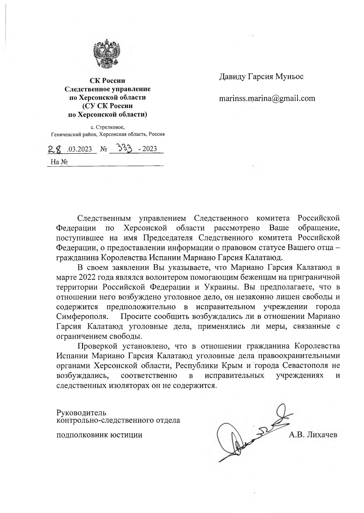 По допомогу Тетяна звернулася до правозахисників, зокрема, до адвоката Української Гельсінської спілки з прав людини, юриста громадської приймальні Благодійної організації Фонд милосердя та здоров’я, документатора злочинів РФ по Херсонській області Олександра Данилова. Щоби мати право офіційно представляти інтереси Маріо, правозахисник уклав угоду із сином волонтера – Давідом Гарсія Муньоз. І надіслав електронне звернення до слідчого комітету РФ з вимогою розслідувати викрадення російськими військовими та незаконне утримання цивільної людини – Мар’яно Гарсіа Калатаюд.