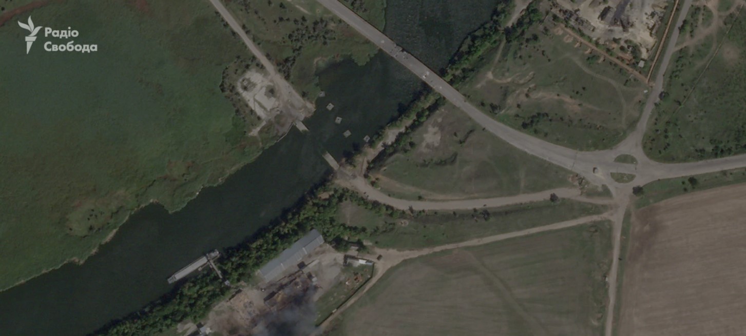 На супутникових знімках Planet Labs помітно знищення понтонного мосту окупантів у районі села Дар'ївка на Херсонщині.
