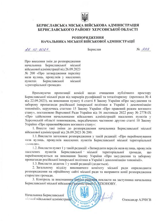 Відповідне розпорядження підписане головою Бериславської МВА Олександром Алчієвим розмістили на сайті Бериславської МА.