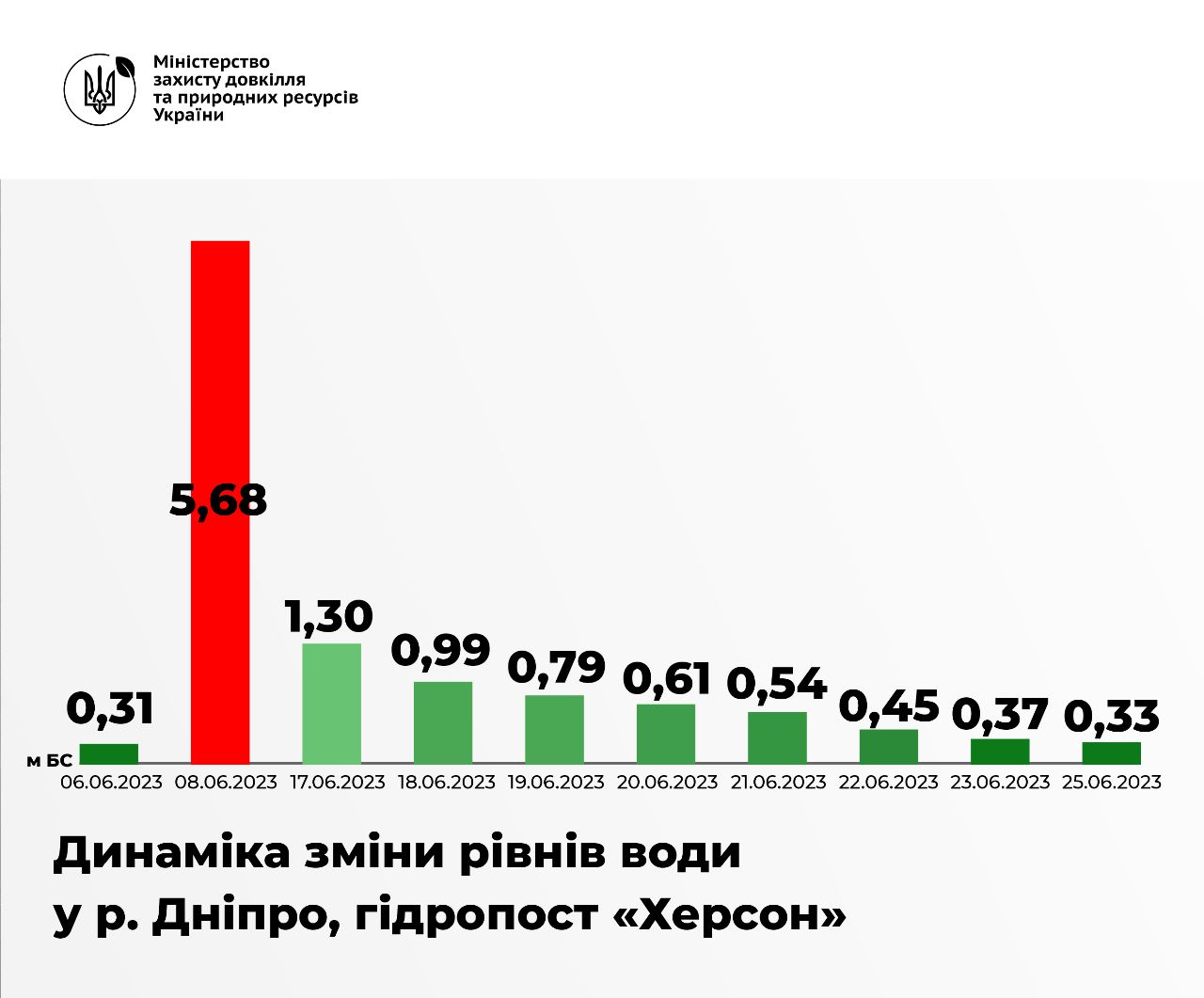 Станом на 25 червня річка Дніпро у Херсоні повернулась у межі русла. Рівень води становить 33 см. За добу рівень знизився на 4 см, сумарний спад з часу підриву Каховської ГЕС – 5 м 35 см.