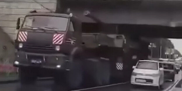 Російська військова вантажівка застрягла під мостом у Херсоні. Водій не розрахував висоту власного транспорту. Про це повідомило видання “МОСТ”.