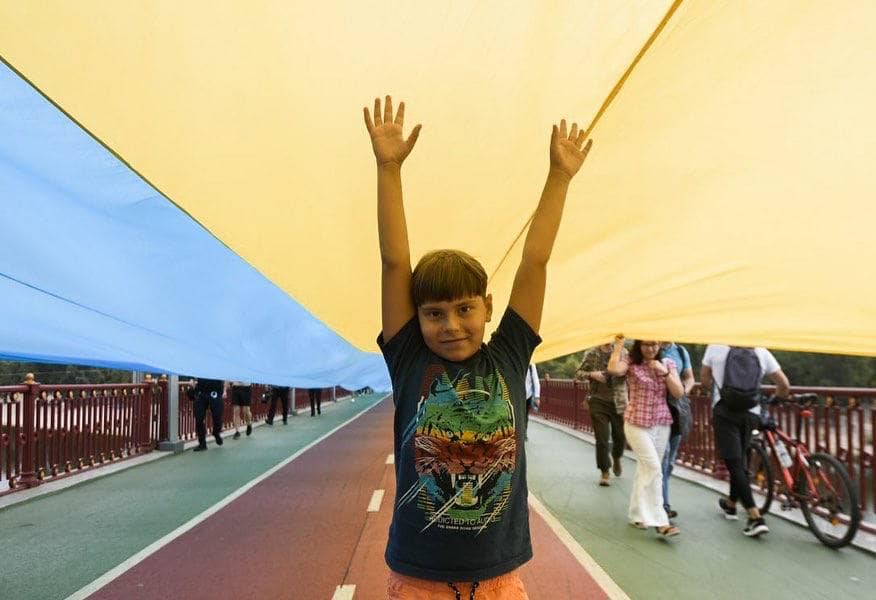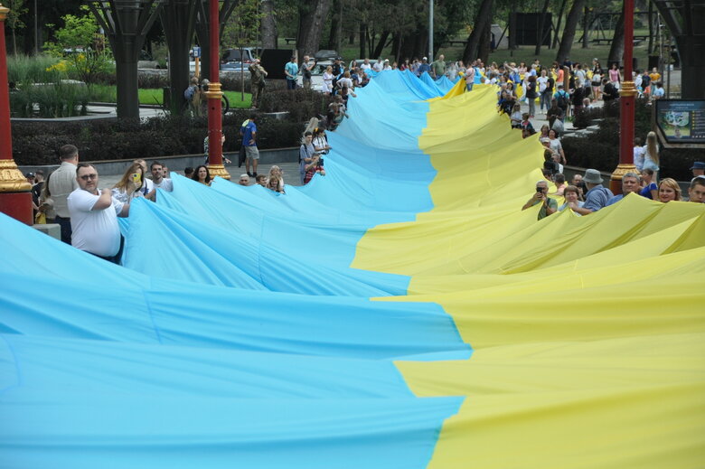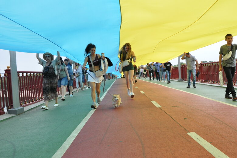 Сьогодні лівий і правий береги Дніпра символічно об'єднали українським прапором довжиною 430 метрів у межах мистецької акції «Україна — єдина».