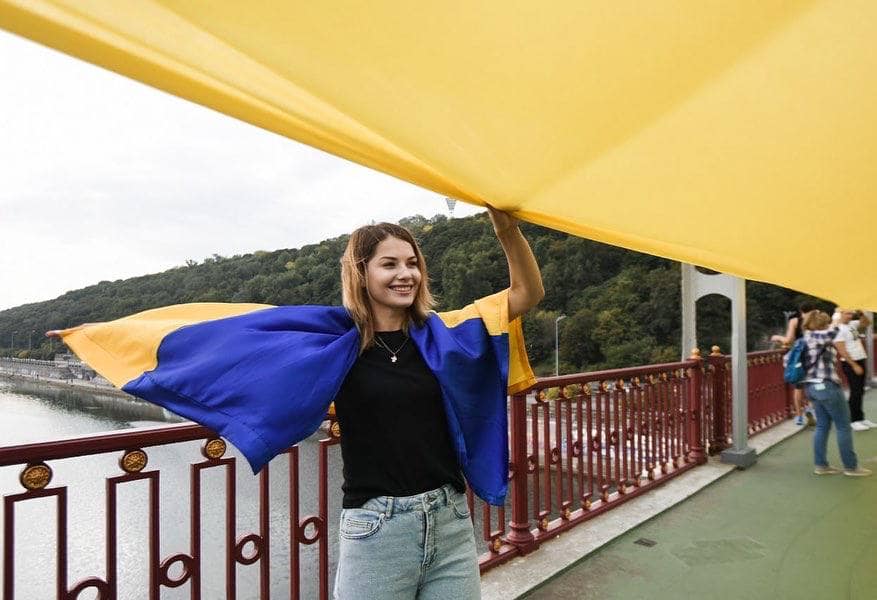 Український стяг розгорнули через Парковий пішохідний міст на Труханів острів у Києві, повідомляє Херсонська міська рада.