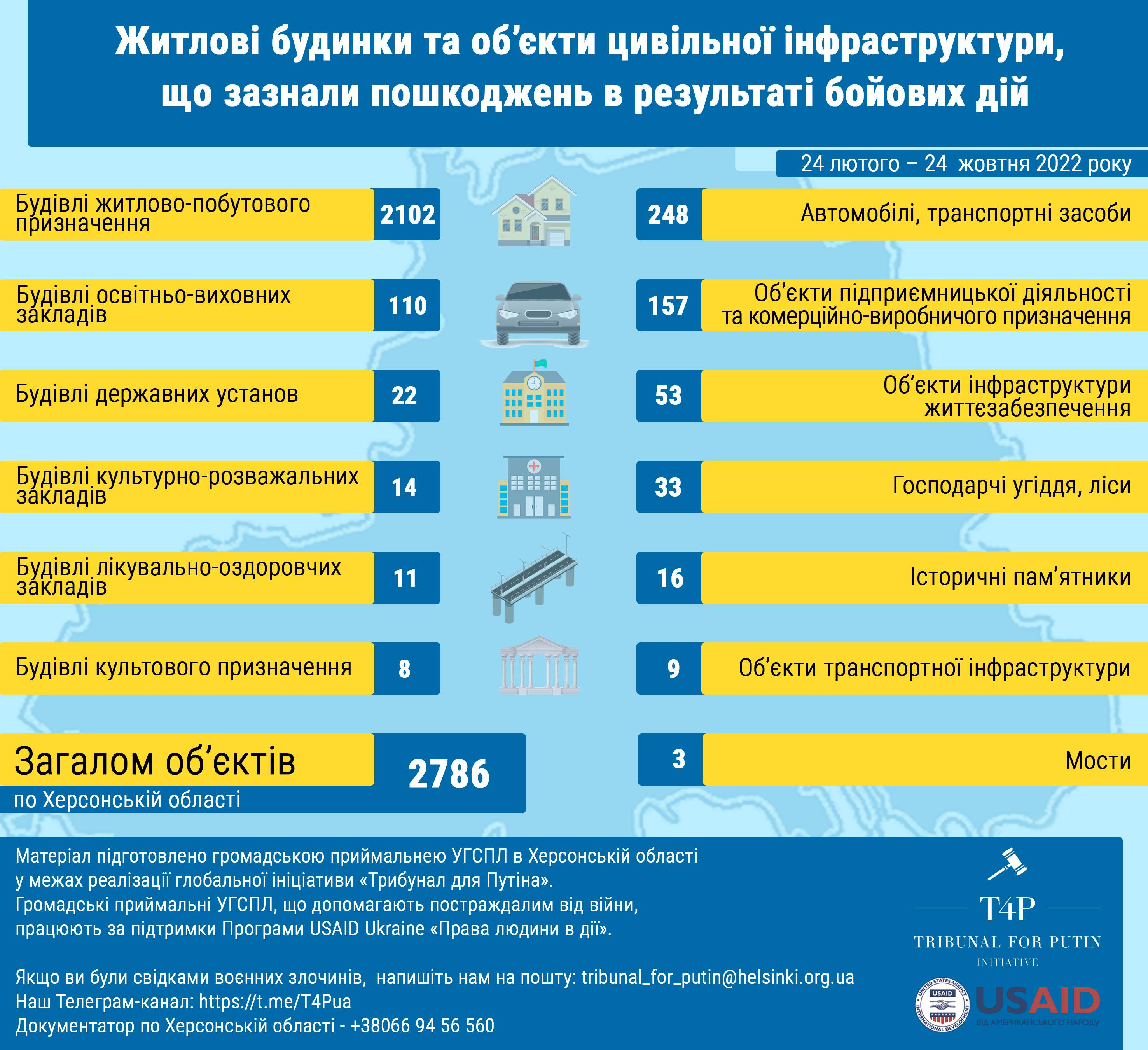 Юристи Української Гельсінської спілки з прав людини в рамках глобальної ініціативи «Трибунал для Путіна» записують свідчення очевидців і документують факти геноциду, злочини проти людяності, воєнні злочини росіян. УГСПЛ оприлюднила підсумок 243 днів війни – про події, що відбулися в Херсоні та області з 24 лютого по 24 жовтня 2022 року. Експерти наголошують, ця інформація не є вичерпною, звіт спирається лише на зібрані ними дані.