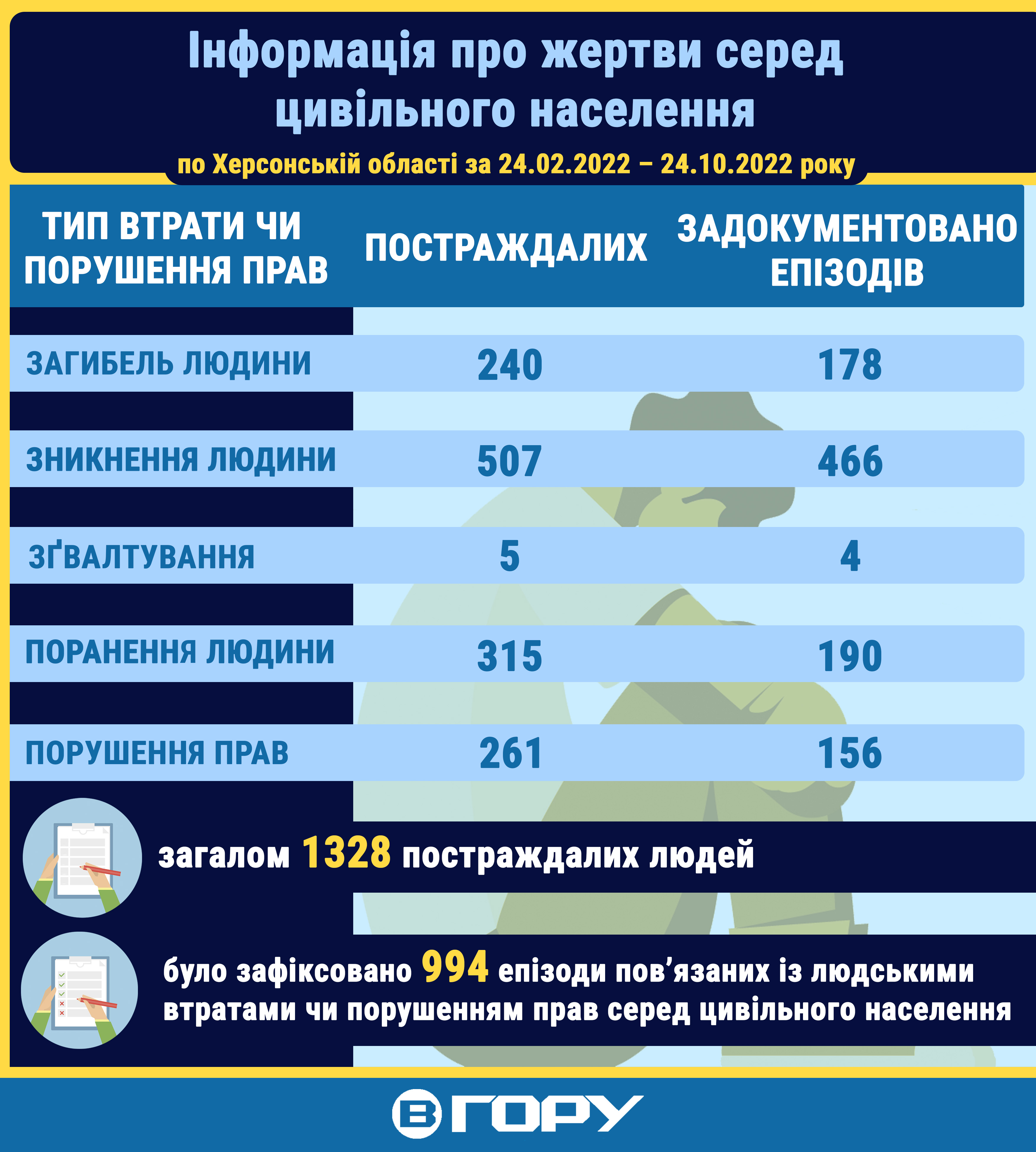 Загалом на Херсонщині від дій окупантів постраждали 1328 осіб. Унаслідок артобстрілів та бойових дій загинуло щонайменше 240 мешканців області, поранено 315 людей, 507 – були викрадені.