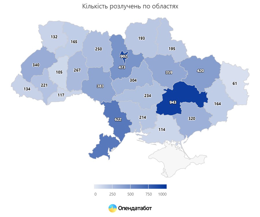 Водночас кількість зареєстрованих розлучень знизилася майже вдвічі – на 42% відносно першого півріччя 2021: 7632 розірвань шлюбу проти 13 153 у 2021 році.
