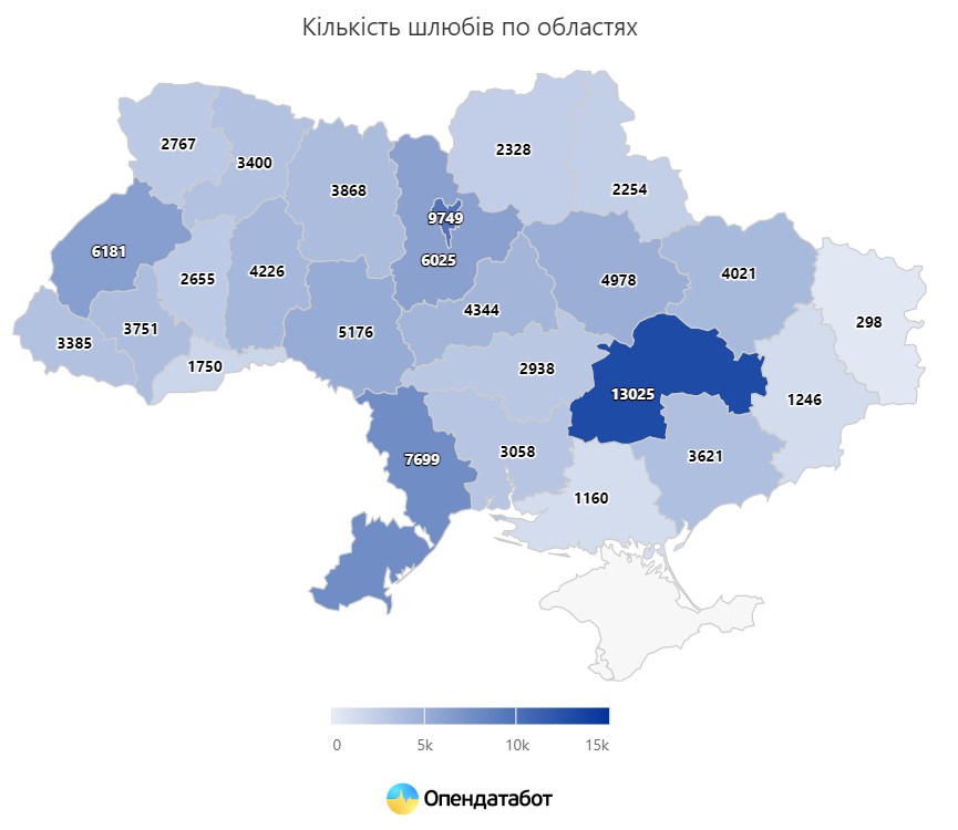«За кількістю одружень лідирує прифронтова Дніпропетровська область – за цей період у регіоні було зареєстровано 13 025 родин. Зростання кількості нових сімей також спостерігається в усіх тилових областях – окрім Чернівецької. Там від початку року кількість шлюбів знизилася на 11% у порівнянні з відповідним періодом минулого року», – йдеться в повідомленні.