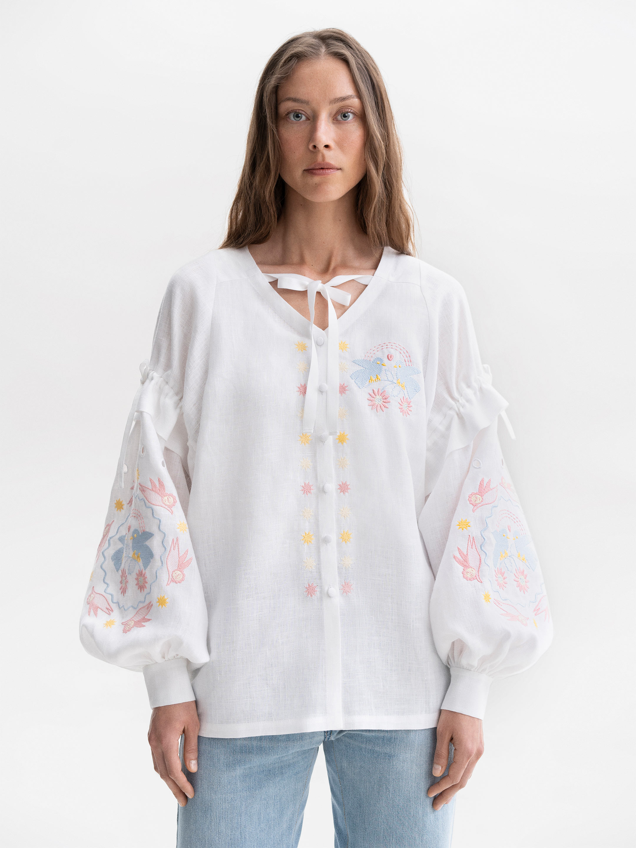 “Чудернацьких янголів, птахів та казкові орнаменти ми змалювали прямо зі стелі того самого будинку в Олешках. Пропустили через власне бачення, стилізували та перенесли на сорочку “Поліна”, – так розповіли про вишиванку в “Етнодомі”.