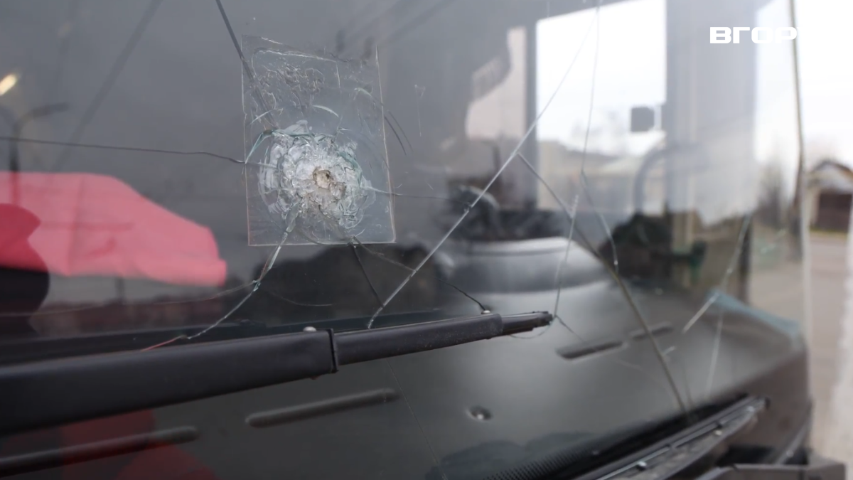 Пошкоджене скло в автобусі після російського обстрілу. Скриншот із відео Олександра Андрющенка”Вгору”
