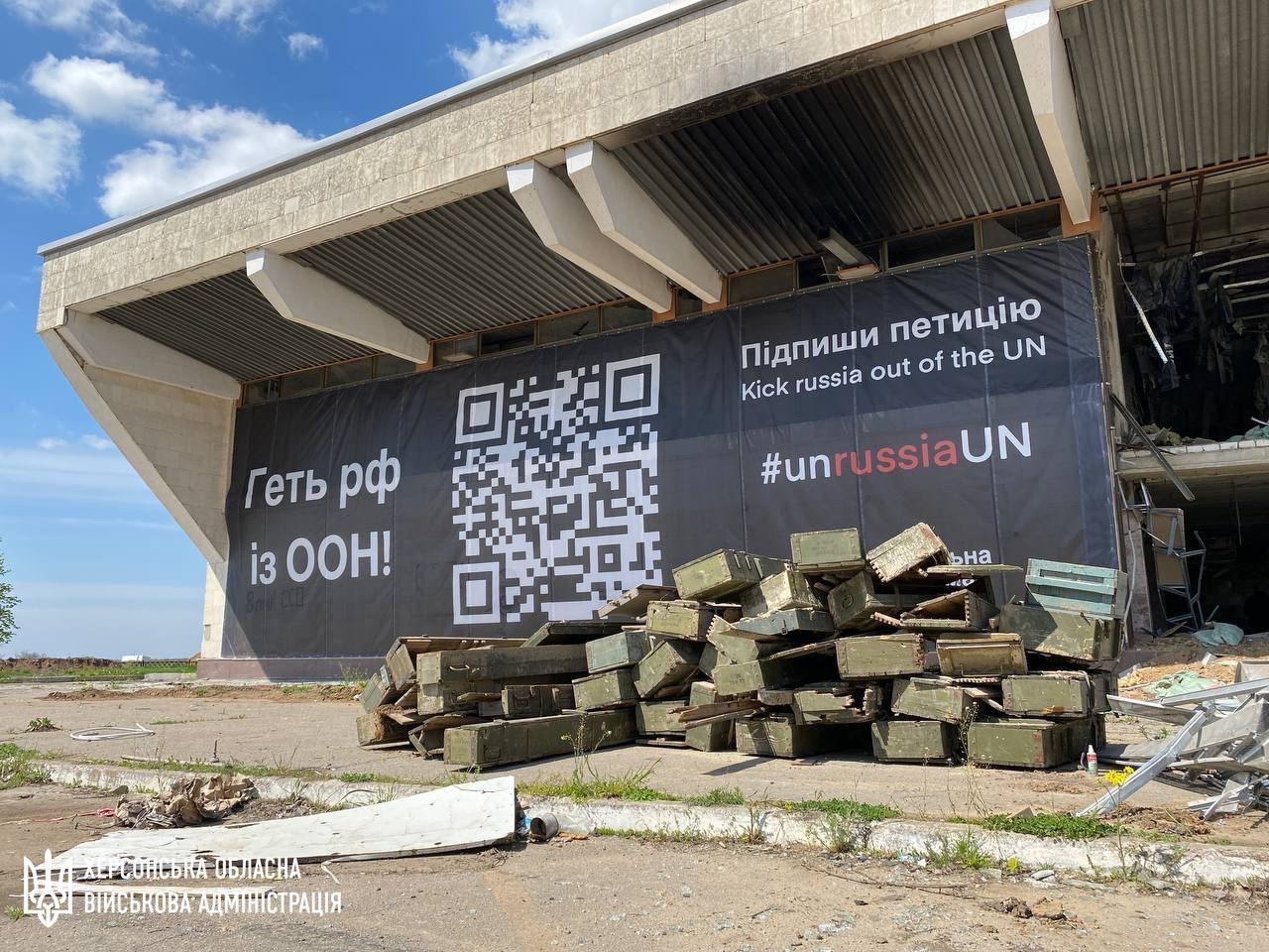Зокрема на будівлі зруйнованого термінала розміщено петицію із закликом виключити Росію зі складу ООН.