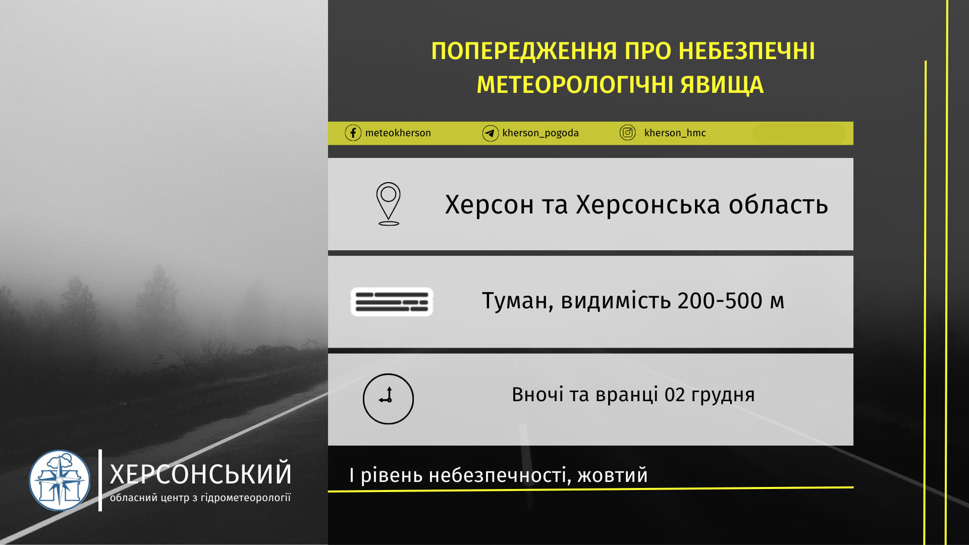 Херсонський обласний центр із гідрометеорології попереджає про туман першого рівня небезпечності в Херсонській області та в Херсоні завтра, 2 грудня.