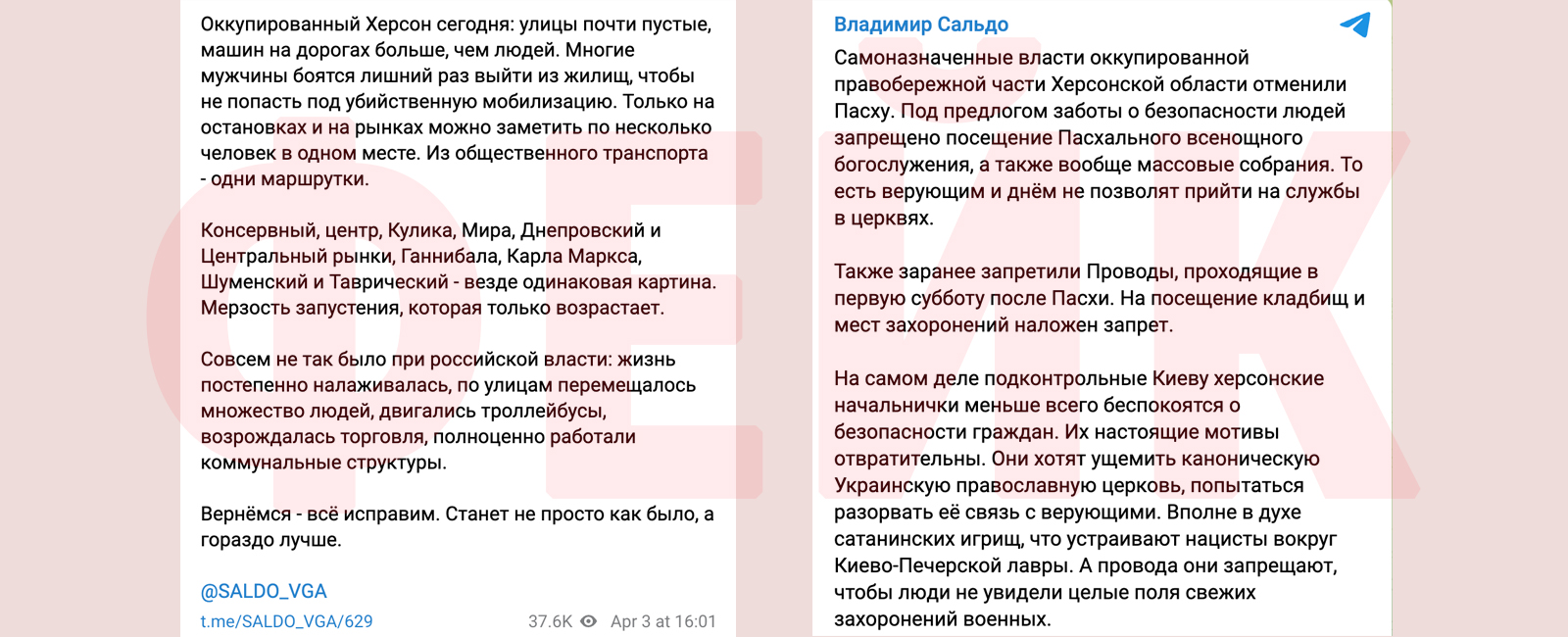 У своєму Телеграм-каналі колаборант сальдо стверджує, що Херсон – він називає його “оккупированный Херсон” – став менш людним, бо чоловіки не виходять на вулицю через нібито “убийственную мобилизацию”. До того ж сальдо пише, що влада нібито скасувала Великдень та має намір утискати Українську православну церкву.