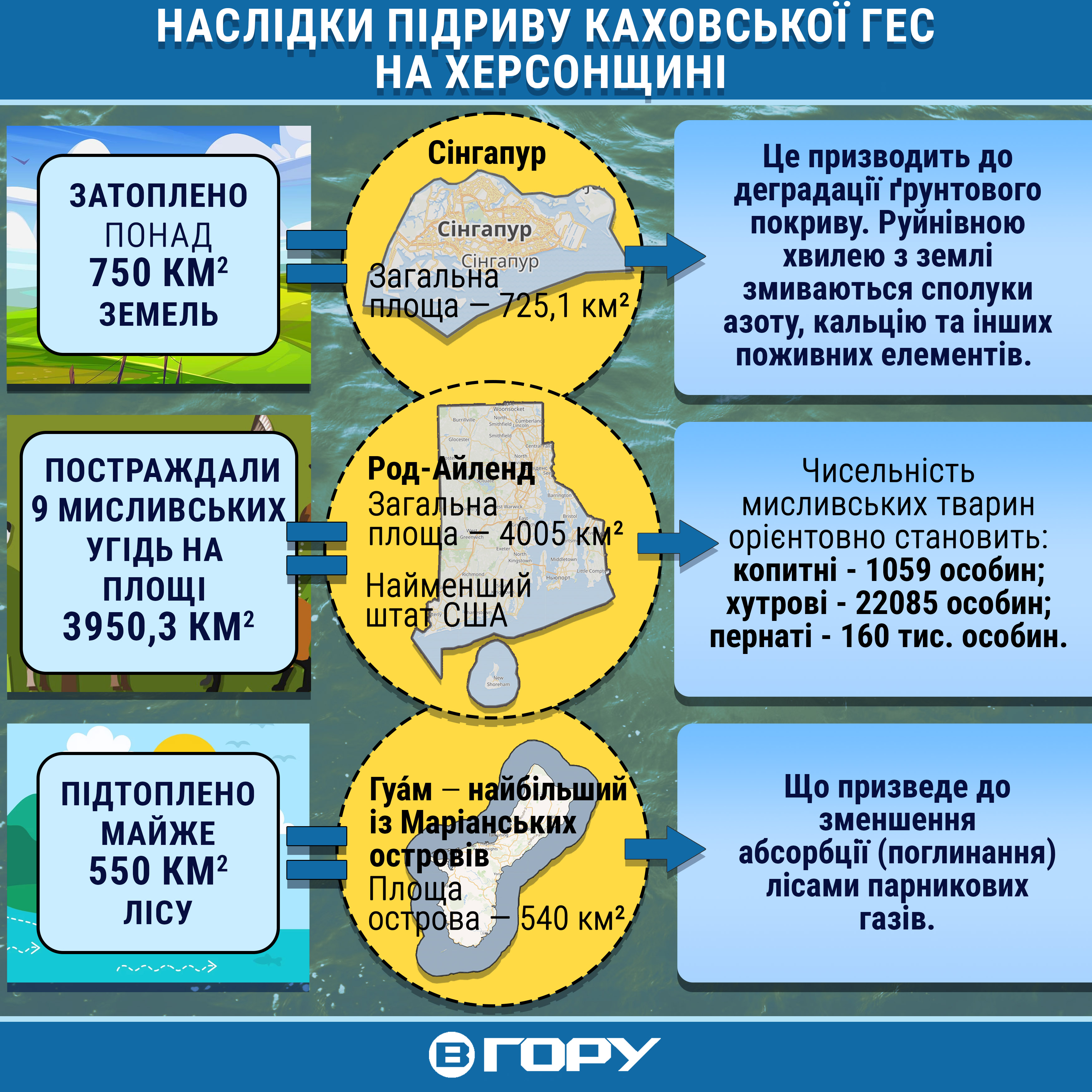 На Херсонщині затопило понад 750 км² території. Це як площа цілого Сінгапура — міста-держави на островах Південно-Східної Азії. Про наслідки катастрофи таких масштабів дивіться в нашій інфографіці.
