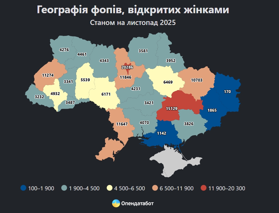 Найбільше нових жіночих ФОПів зареєстровано у Києві – 20 286, на Дніпропетровщині – 15 129, Київщині – 11 846, Одещині – 11 647 та Львівщині – 11 274. Найвищу частку жінок серед нових підприємців мають Сумщина, Полтавщина та Одещина – по 63%.
