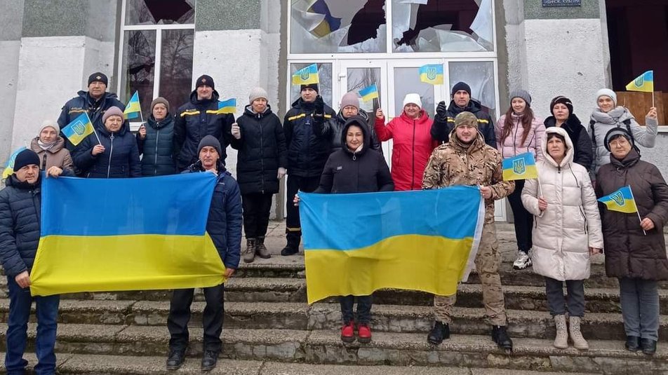 Місцеві жителі Високопільської громади вийшли на вулиці села з синьо-жовтими прапорами та на фоні пошкоджених ворожими снарядами будівель утворили живий ланцюг єдності. Про це повідомляє Високопільська селищна військова адміністрація у Facebook.