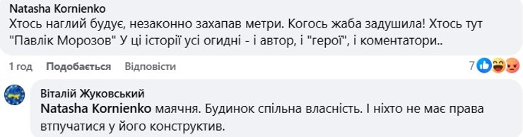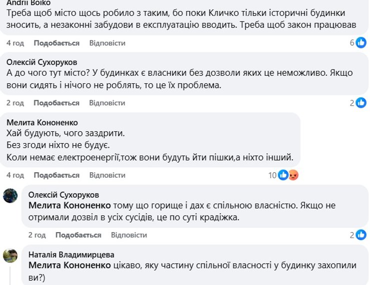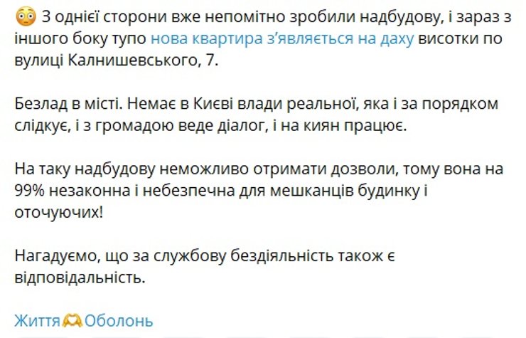 "Беспорядки в городе. Нет в Киеве власти реальной, которая и за порядком следит, и с общиной ведет диалог, и на киевлян работает. На такую надстройку невозможно получить разрешения, поэтому она на 99% незаконна и опасна для жильцов дома и окружающих! Напоминаем, что за служебное бездействие тоже есть ответственность", — говорится в публикации.
