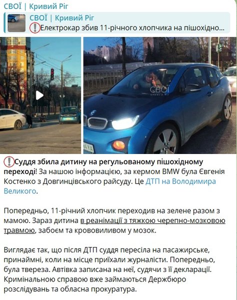 11-летний мальчик из Кривого Рога оказался в больнице в тяжелом состоянии после того, как накануне его на регулируемом пешеходном переходе сбила судья одного из районных судов города на BMW. Ребенок переходил дорогу вместе с мамой.